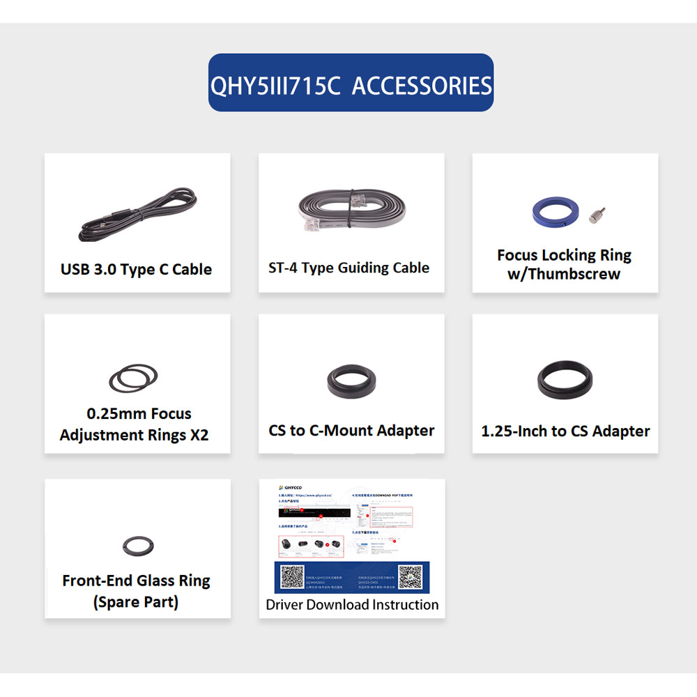The 715C comes with everything needed to start imaging! A USB3.0 type-C cable provides power and PC connectivity. Also included is an ST4 guiding cable, a focus lock ring with a thumb screw, two 0.25 mm focusing adapter rings, a CS- to C-Mount adapter, a 1.25" to CS-Mount adapter, a filter coated front window, as well as instructions for downloading the device driver.